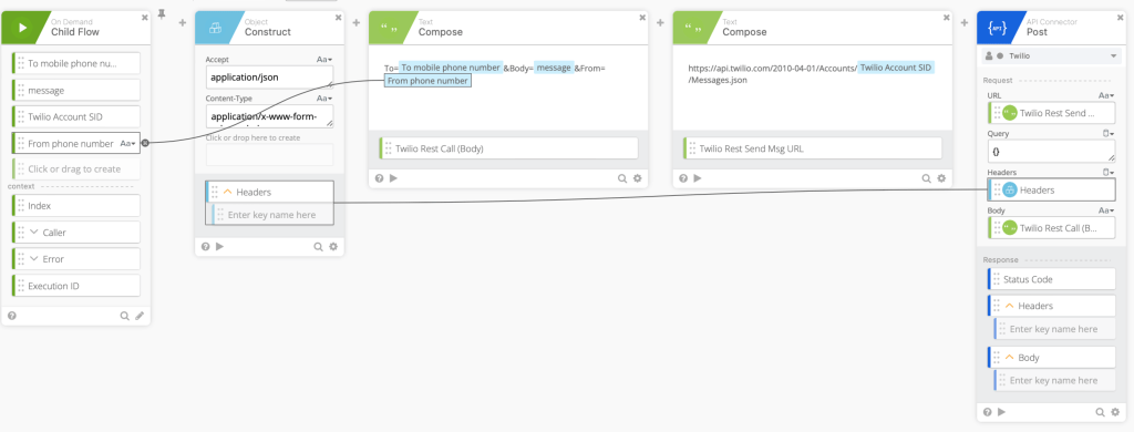 To phone number,message, andFrom phone numberinformation - The next Text – Compose card sets the Twilio endpoint with the