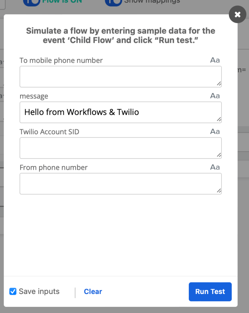 This flow creates a text messages and sends it via Twilio SMS API. The flow is meant to be called as a helper flow. This means you can call it from any other flow.