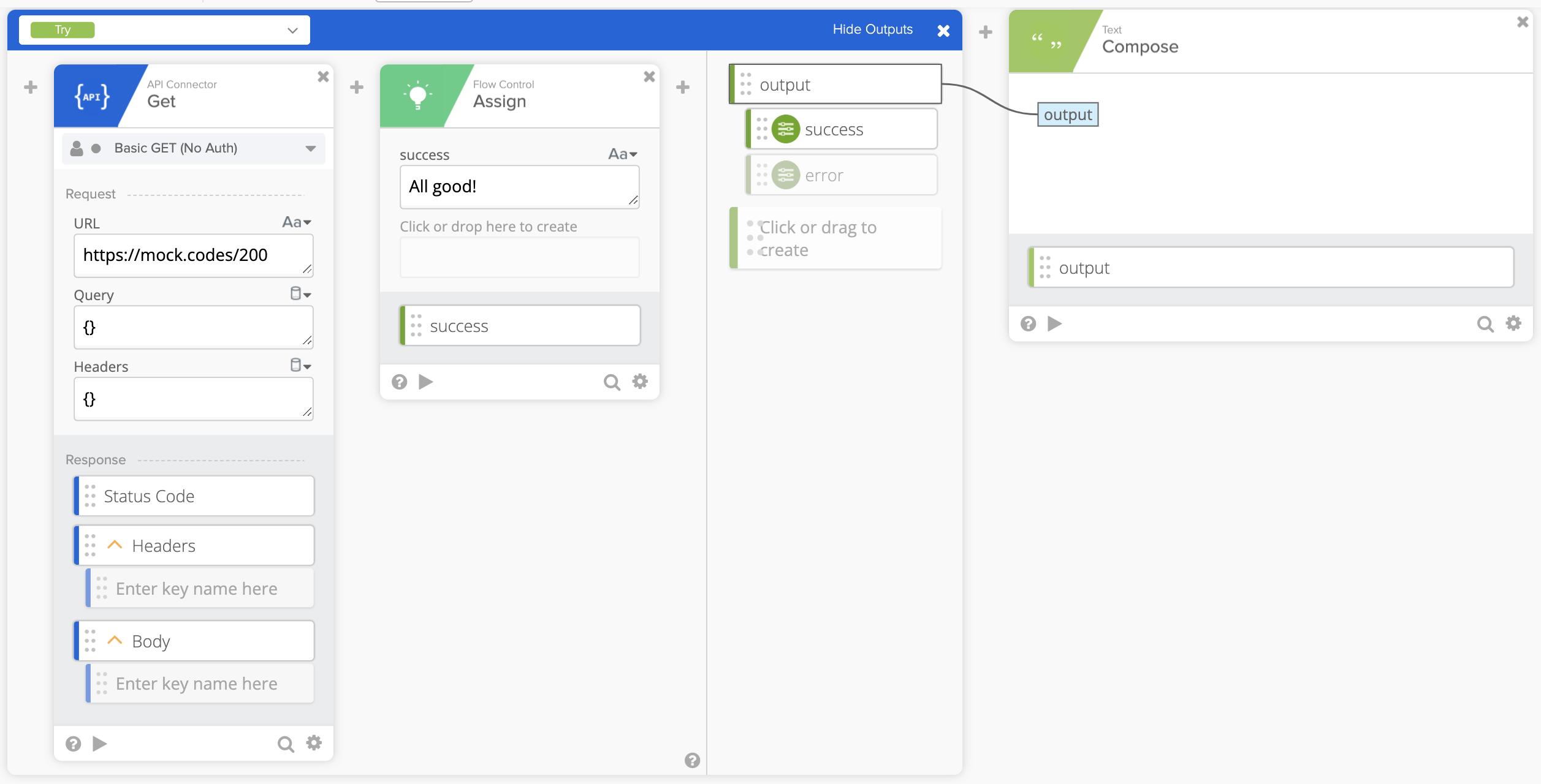Running the flow with HTTP response 200 (https://mock.codes/200) that results in success: