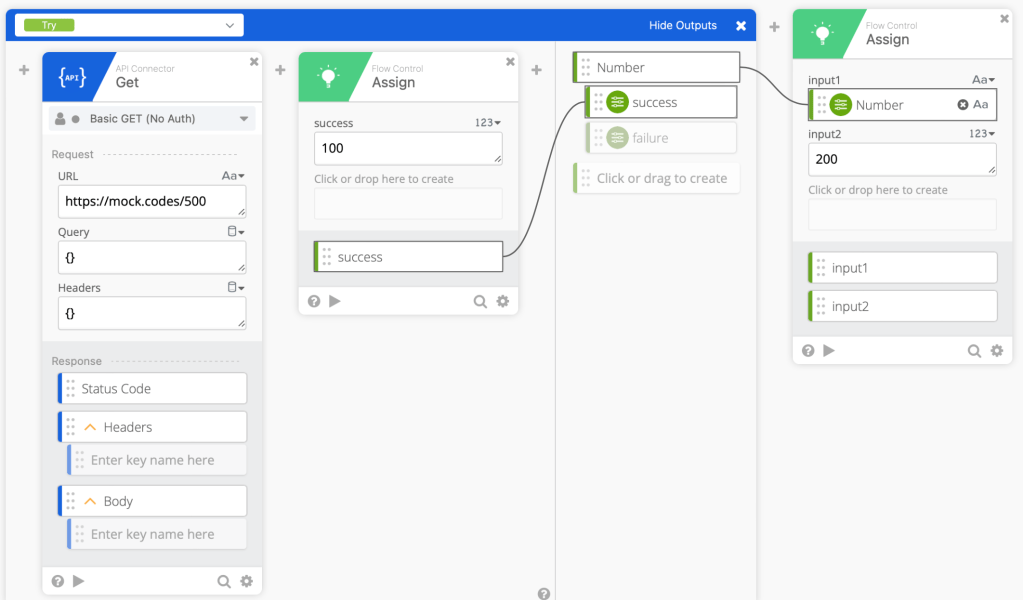 For example, in the screenshot below, the API call fails, the flow stops executing, and the Assign card is not processed.