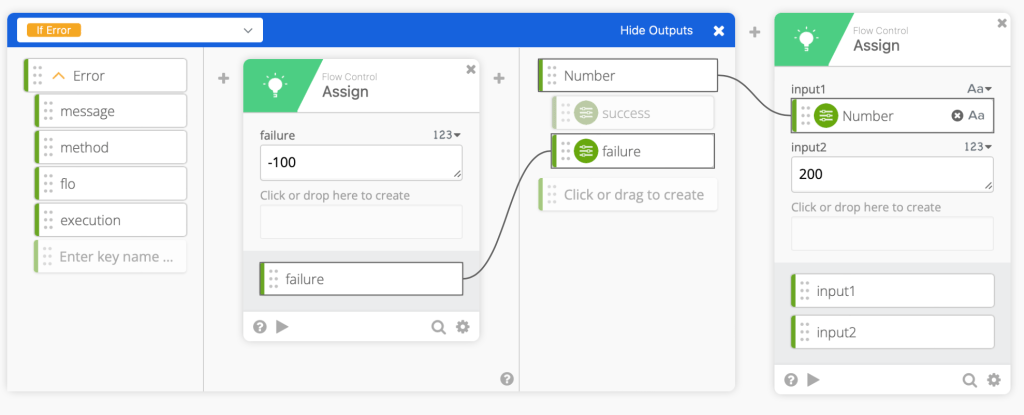 The If Error card allows to define output. Based on the path taken, the Number will be set to either 100 or -100.