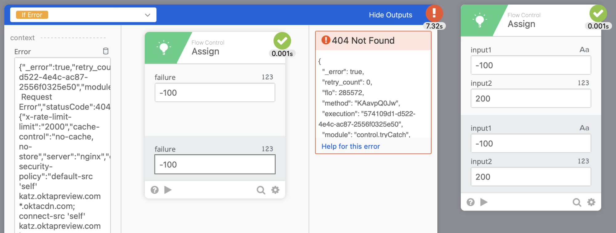 If the flow generates an error, the If Error card handles the error, and the flow execution continues. The Assign card outside of If Error was processed.
