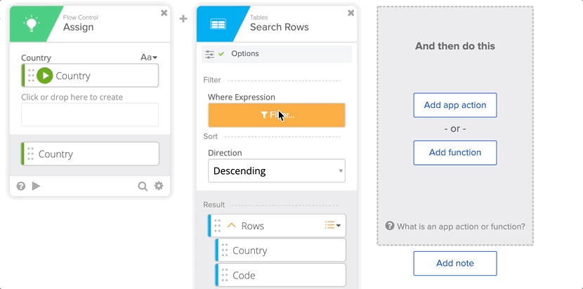 When using the Tables – Search Rows card to search a table you can connect data from any card that comes before it.