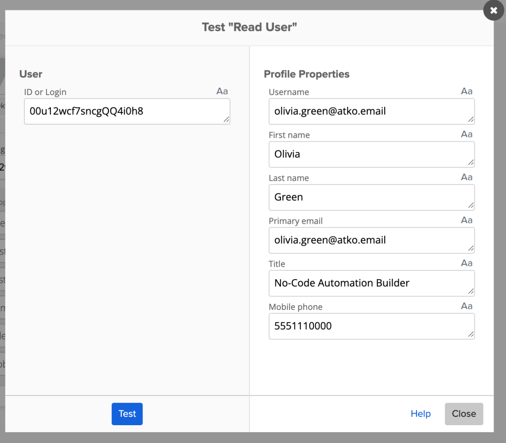 Testing individual cards in a flow is highly encouraged. When using Okta – Read User or Okta – Read Group card, the test will prompt you to enter an ID for a user or a group.