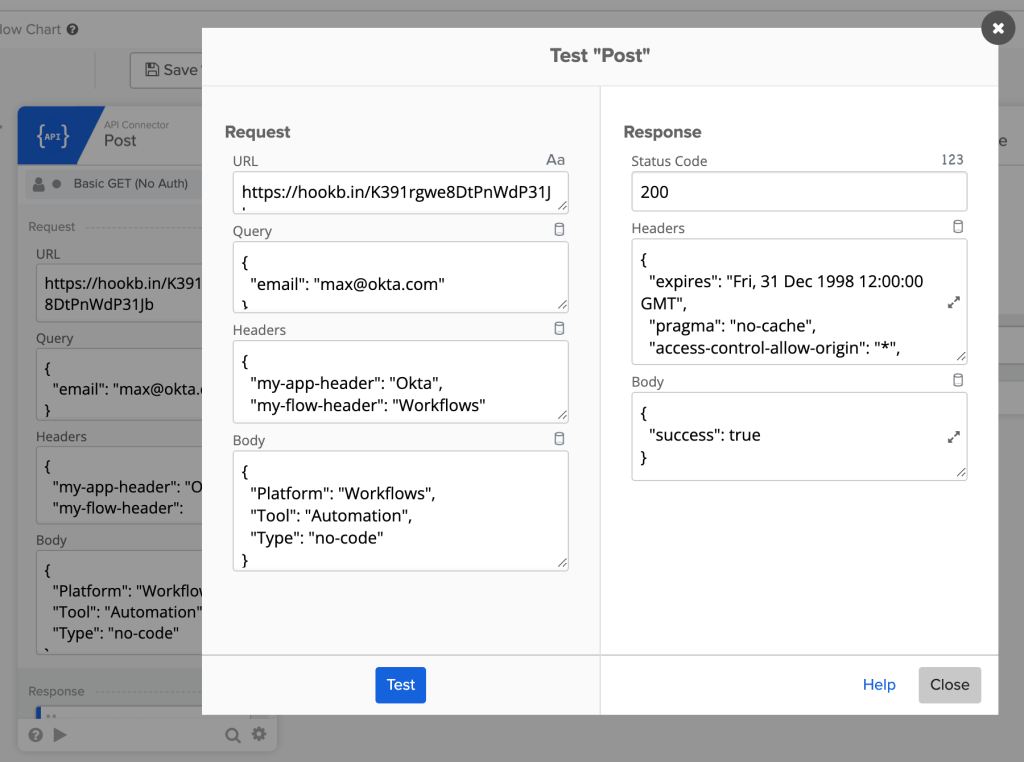 A good tip, particularly when sending a raw request with API Connector card, or trying to compare request with Postman, is to send a request to a service like Hookbin that allows you inspect what’s being sent from Workflows and compare it with your other request.