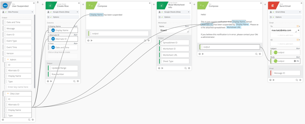 - A step-by-step tutorial with lots of screenshots: Build Your First Automation With Okta Workflows: Notify When User Is Suspended