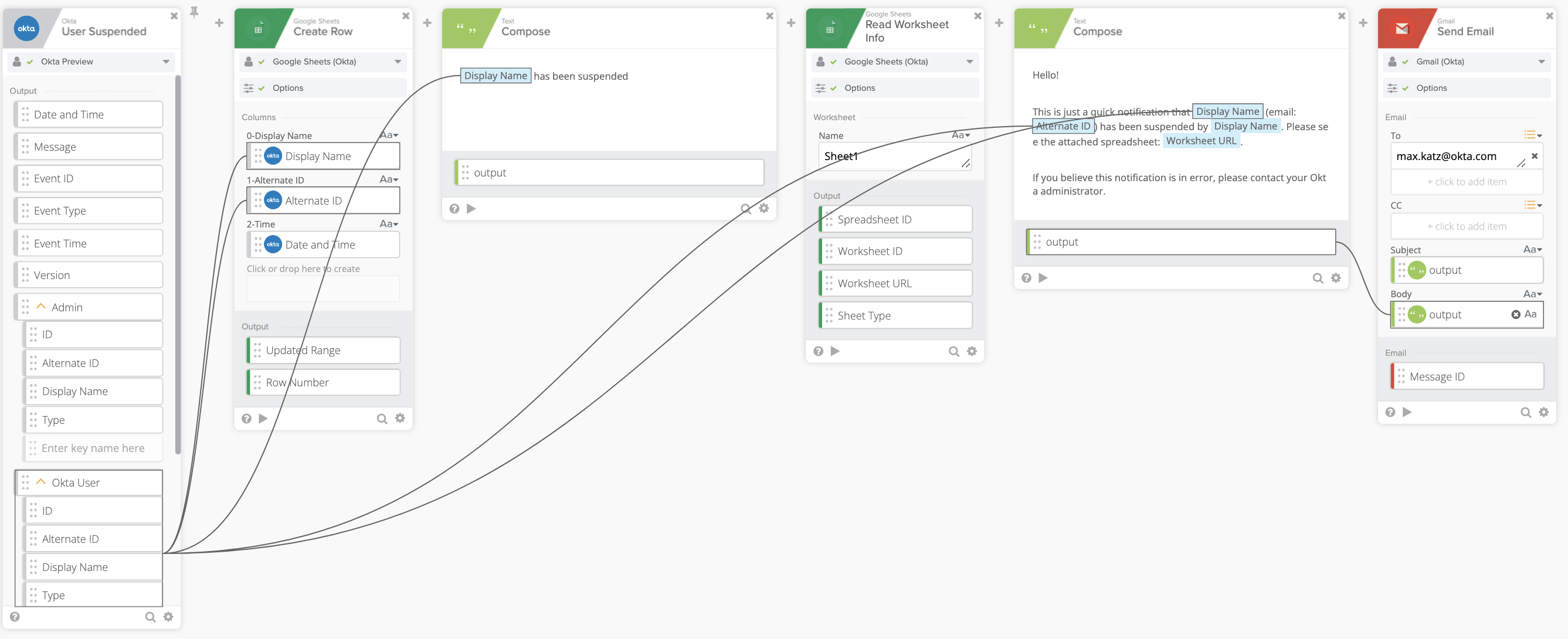 - A step-by-step tutorial with lots of screenshots: Build Your First Automation With Okta Workflows: Notify When User Is Suspended