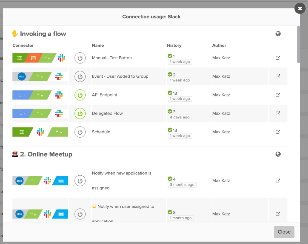 Then click on middle icon to view in which flows this connection is used. The popup lists folders and which flows in those folders use the selected connector.