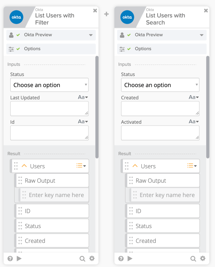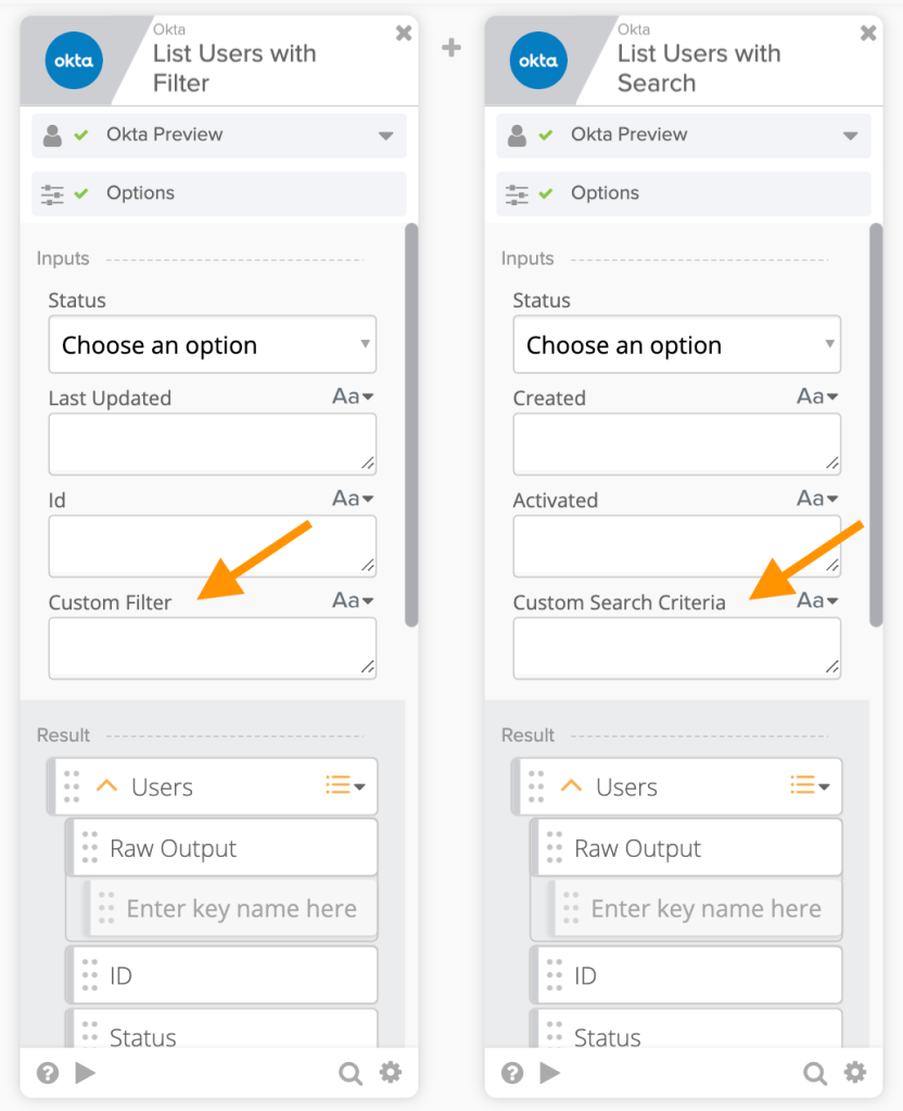 When using Okta – List Users with Filter and Okta – List Users with Search cards, the custom search criteria is not show by default so you need to enable it.