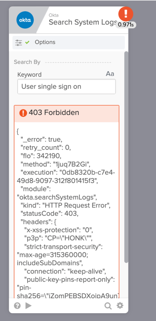 Okta – Search Systems Logs card allows you to search the Okta log by a keyword (and also expression, set in Options):