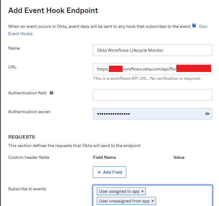 Additionally you have to create an event hook from Okta as indicated in the screenshot: