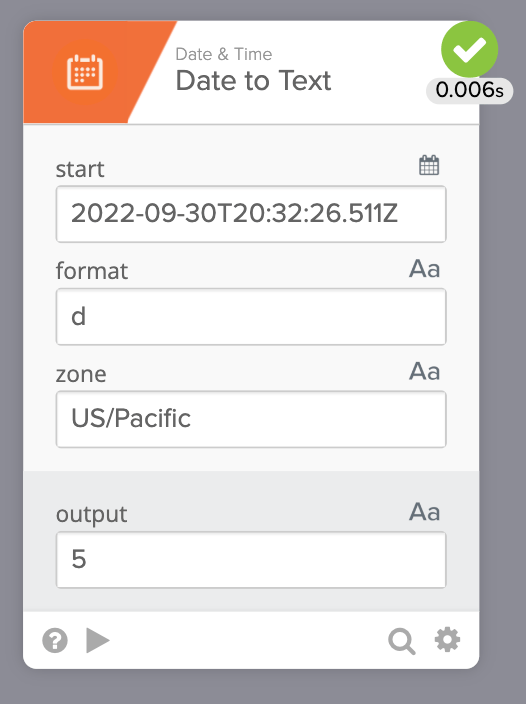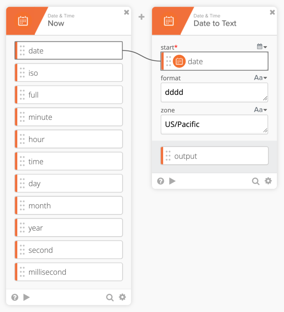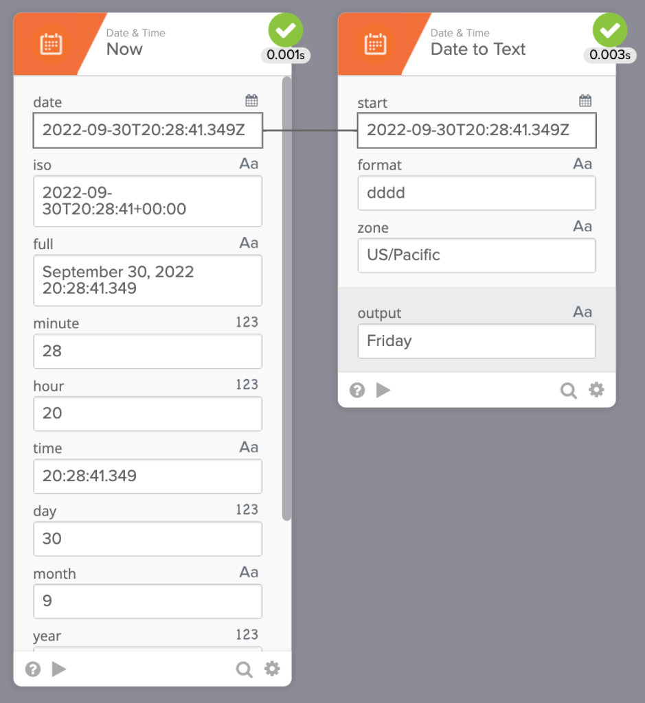 First use Data & Time – Now card to get the current date and time. Then using Data to Text card, set the format to dddd to get the day of the week result (Friday):