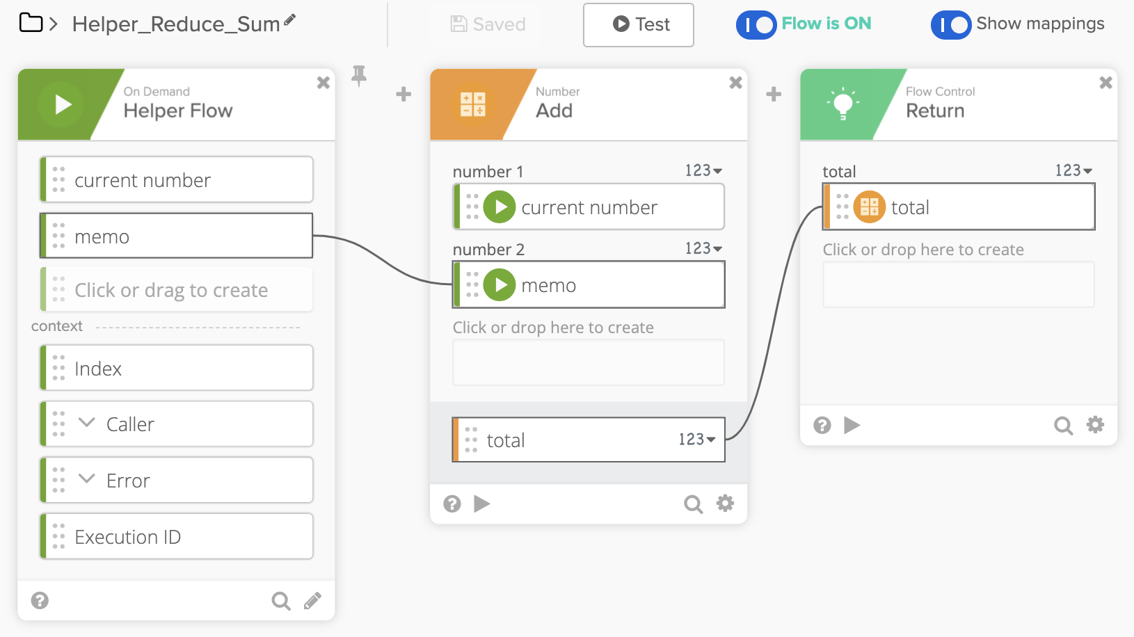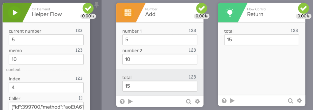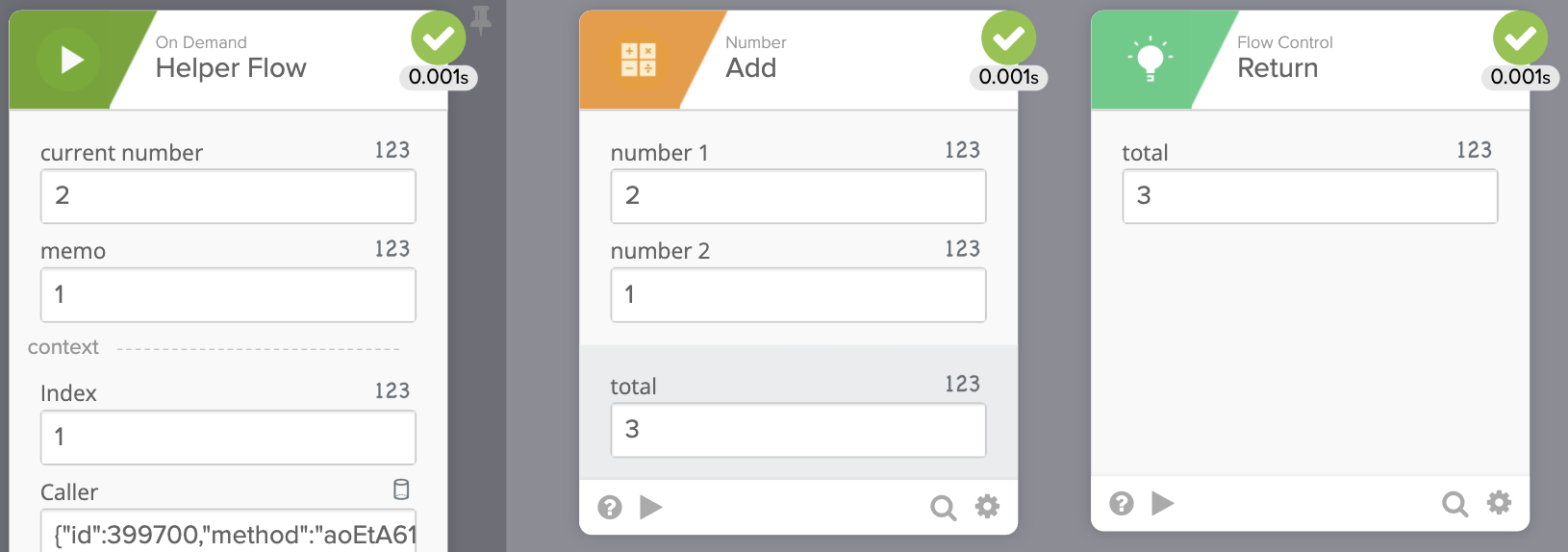 The last card, Flow Control-Return, returns the current sum. This sum value is passed back into the helper flow using the memo field.