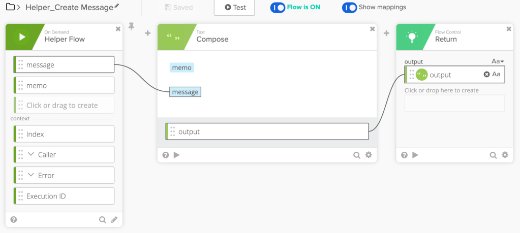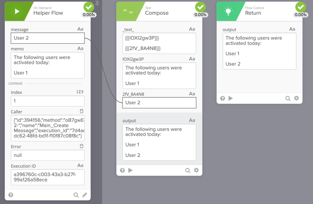 The following screenshot shows the helper flow 2nd execution. It shows how the message is built.