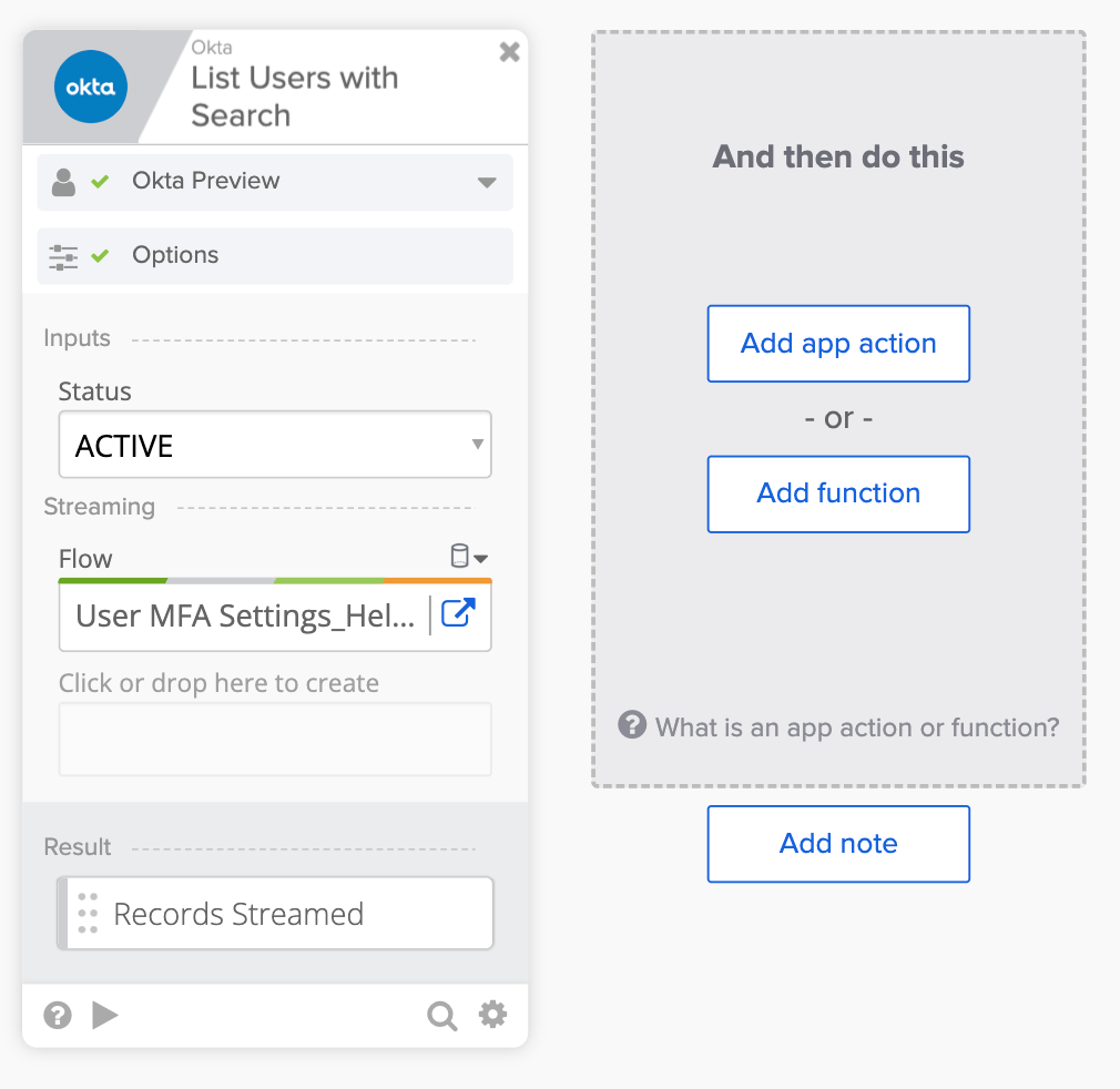 The first flow uses the Okta – List Users with Search card to list active users with the streaming option: