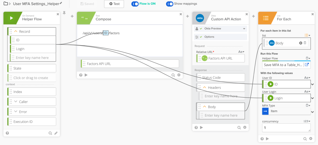 The helper flow below calls /api/v1/users/ID/factors API endpoint using the Custom API Action card to get MFA information for each user in a list.
