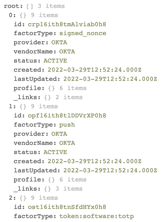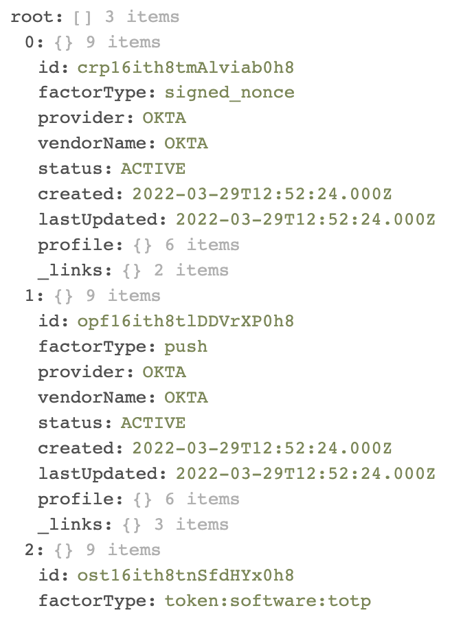 - The Custom API Action card calls the Factors API endpoint. The API returns an MFA factor list (a user can have multiple MFA factors)