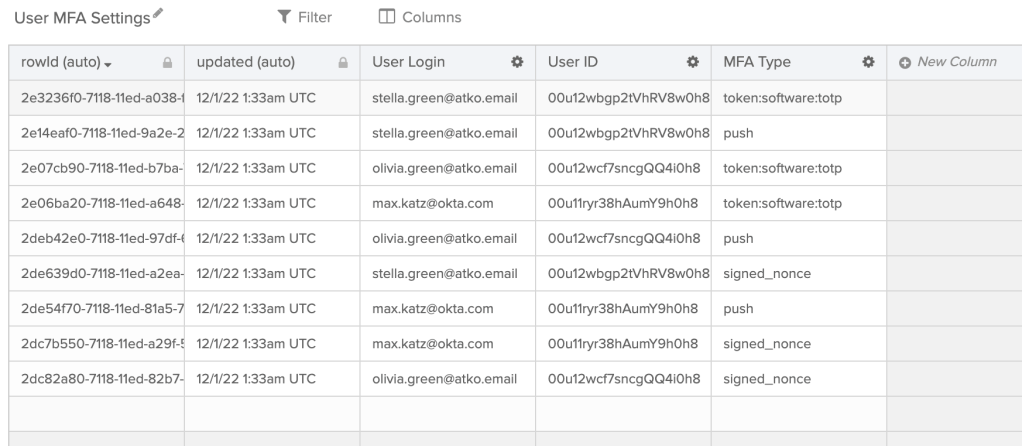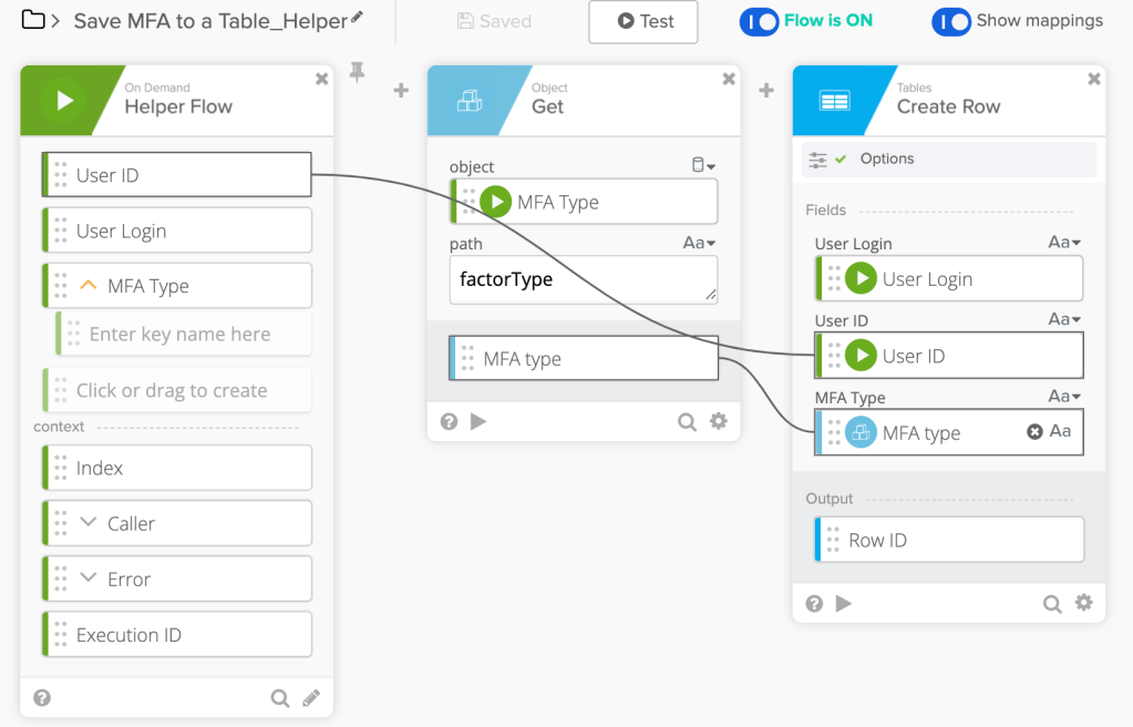 Note: It is not recommended to use a Workflows table for long-term storage. Please read the Save User MFA Information to a Google Sheets Spreadsheet in Okta Workflows guide.