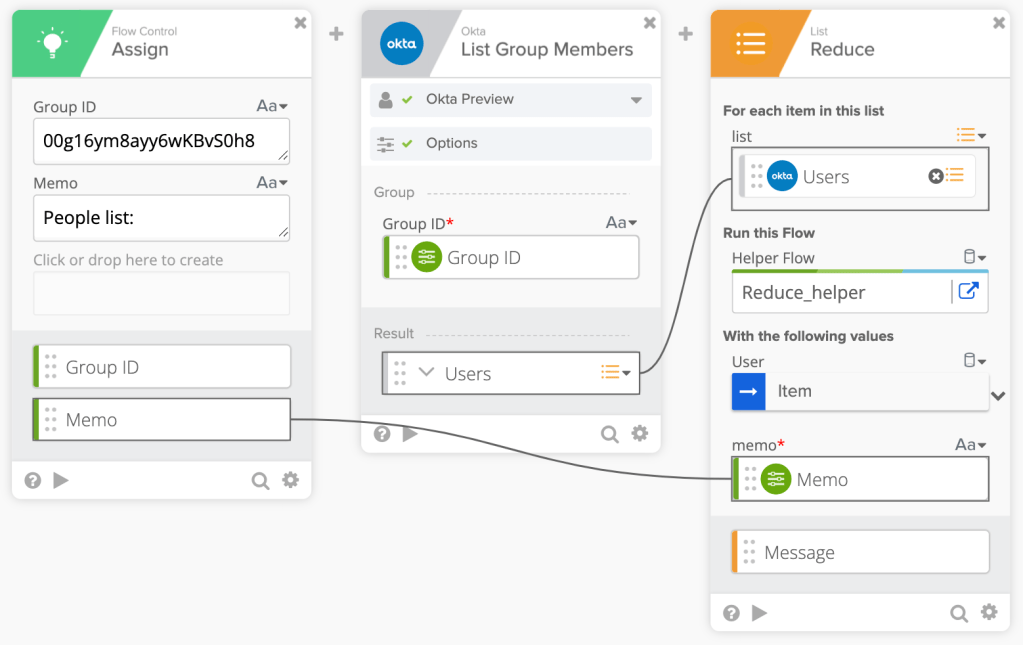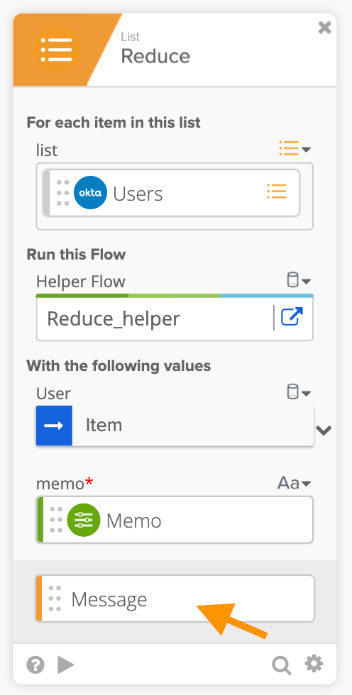 - Reduce – process each item in a list with a helper flow. Reduces the list to a single value that is returned to the main flow