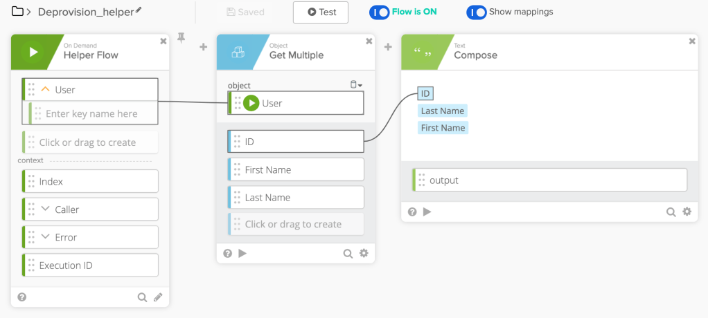 - Helper Flow card defines the flow input. In this example, it is the User object