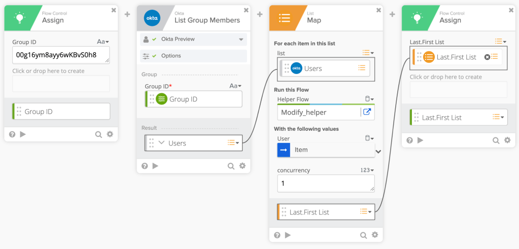 - Map – processes each item in a list with a helper flow. Creates a new list with modified items. A new list is returned to the main flow
