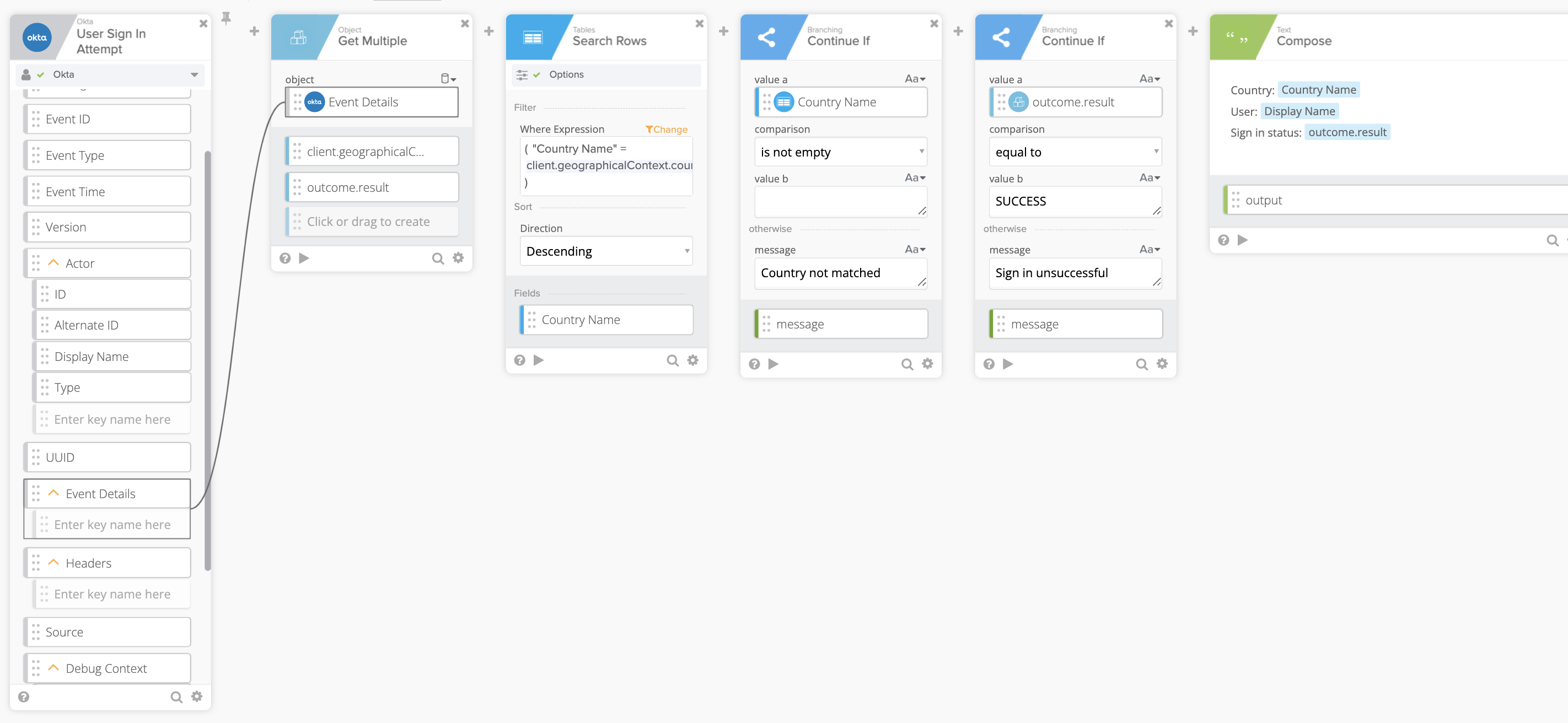 When you use the Okta – User Sign In Attempt event card, the event has information about user’s geolocation.