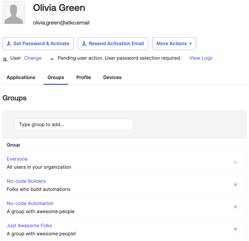 When a user is deactivated, you want to remove the user from all groups. In the screenshot below, user Olivia Green is a member of four groups. The Everyone group is a default group from which a user cannot be removed. You will add logic to check for the Everyone group and skip removing the user from it.