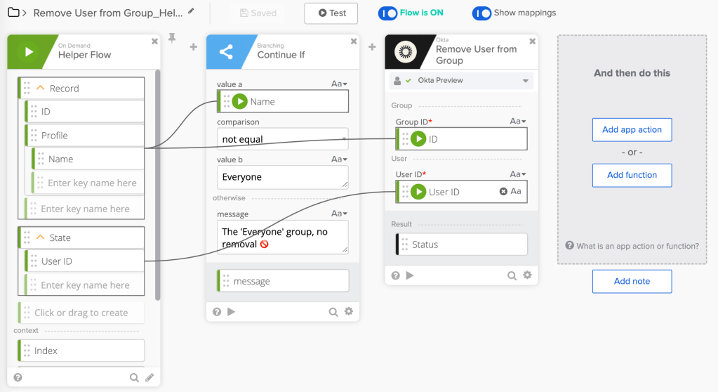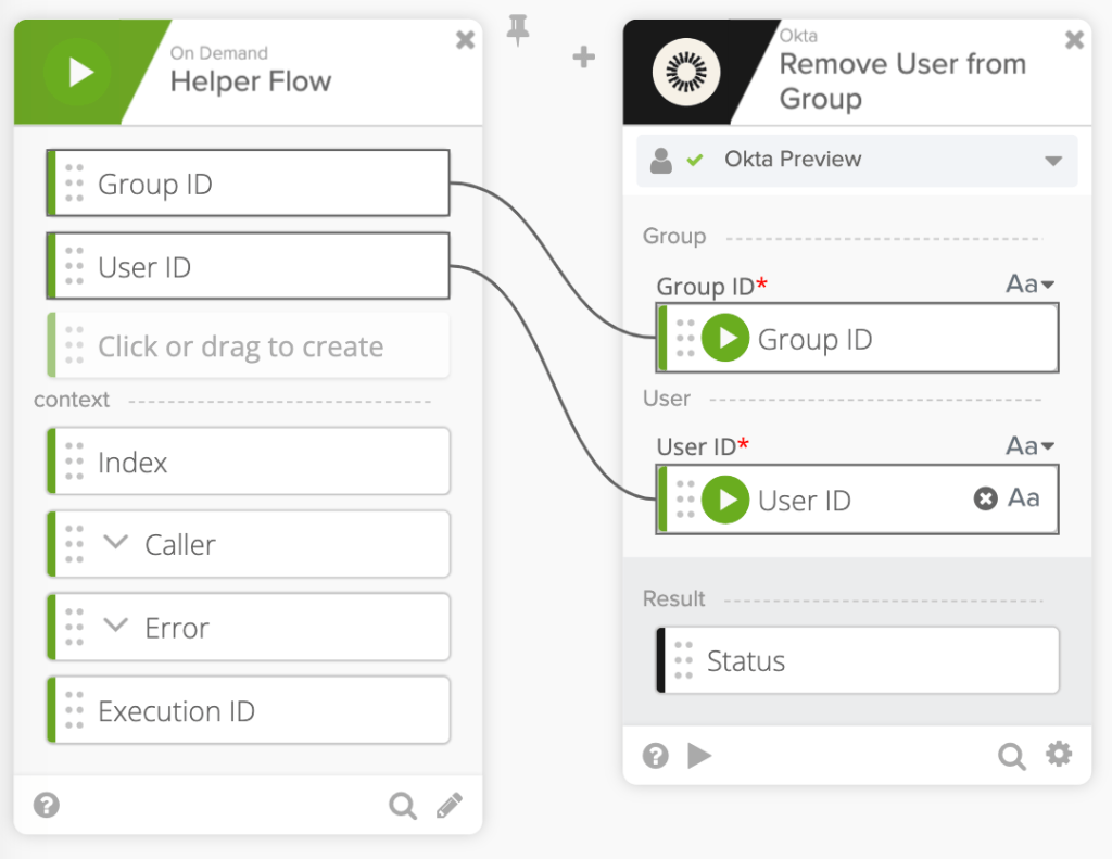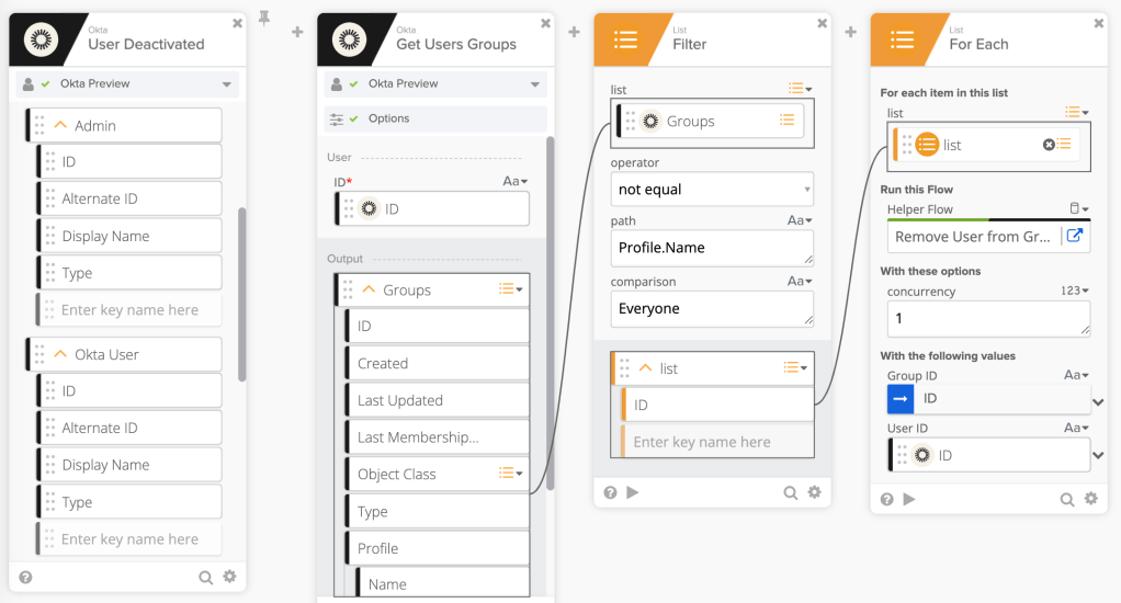 - The Okta – Get Users Groups card finds all user groups and streams the list to a helper flow (Remove User from Group_Helper flow)