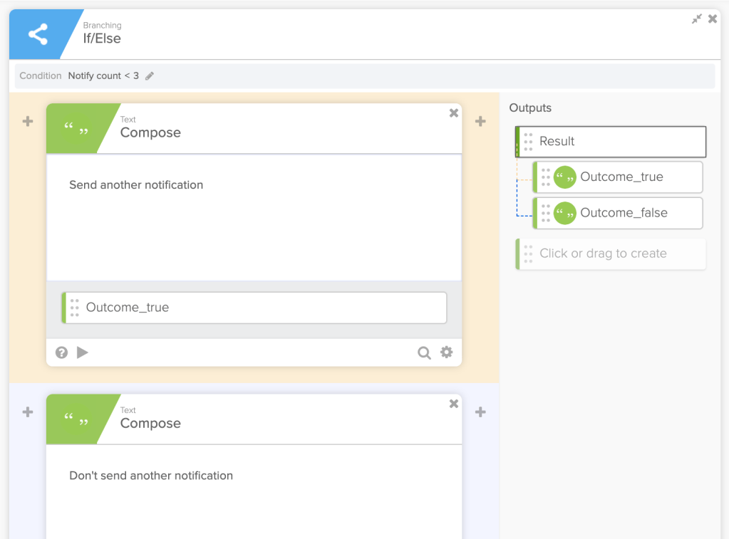 Workflows has the Branching – If/Else card that specifies one condition. In the following example, the card is checking if Notify count < 3: