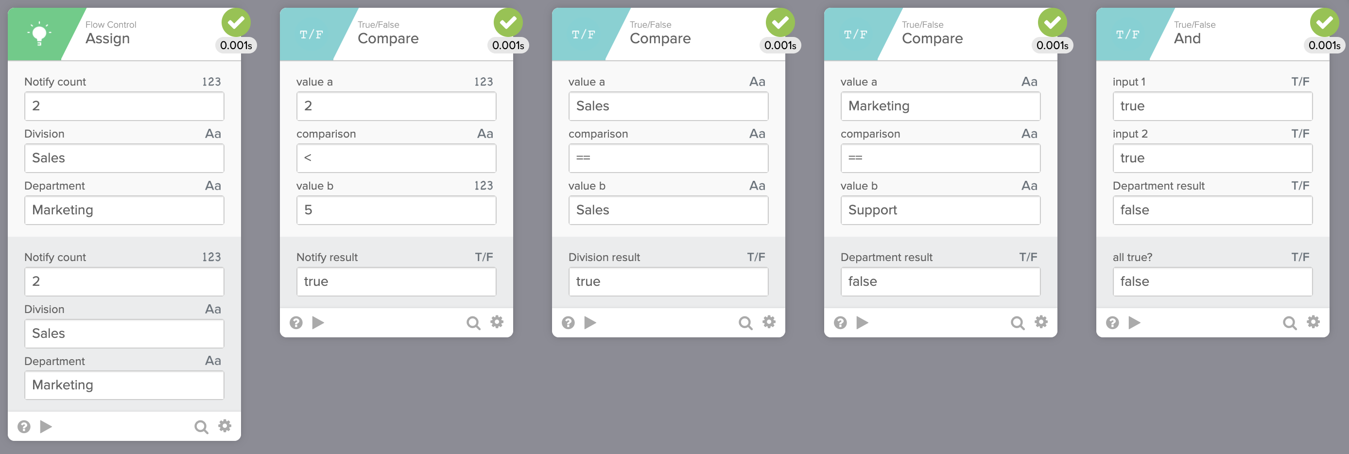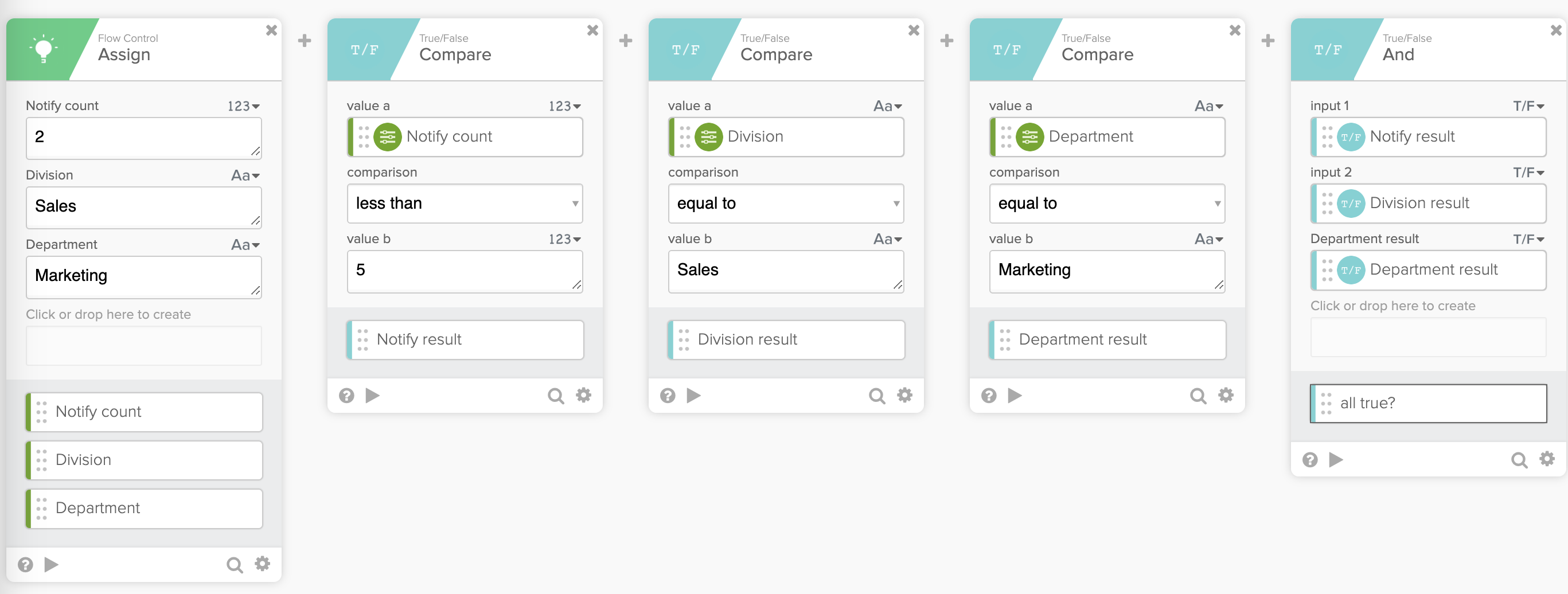 If there three Compare card’s outcome is true, then the outcome of the And card will be true. It looks like this: