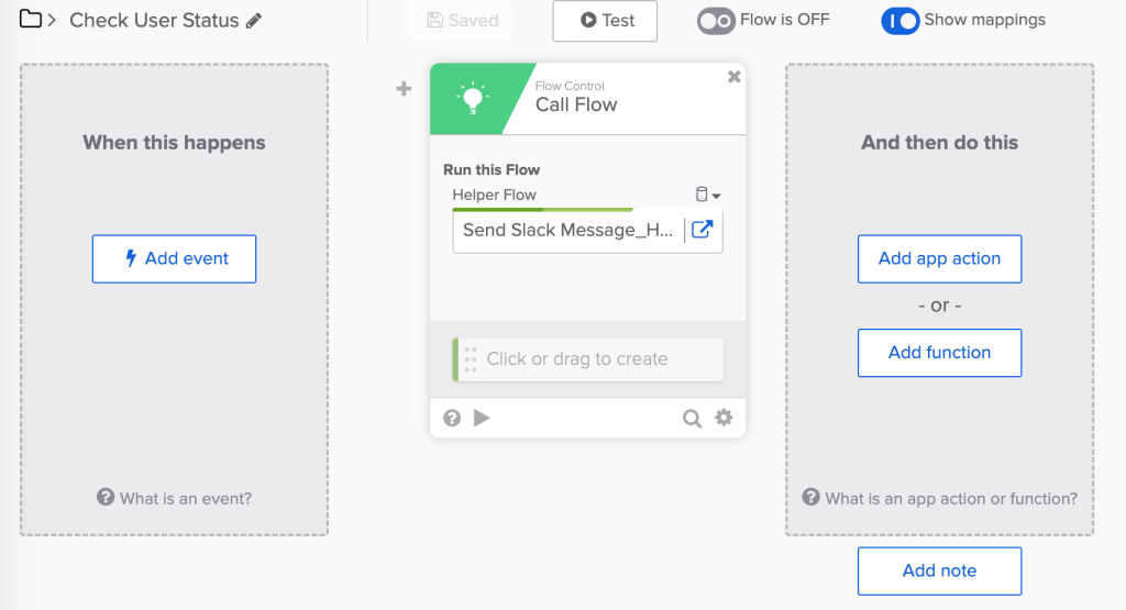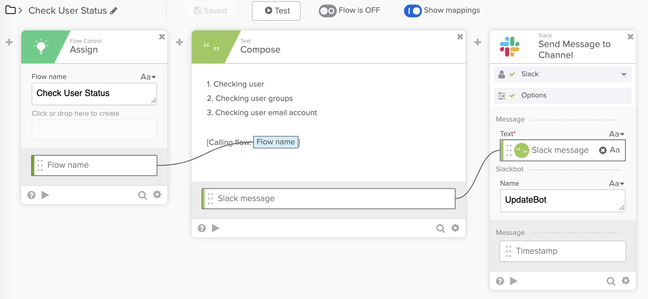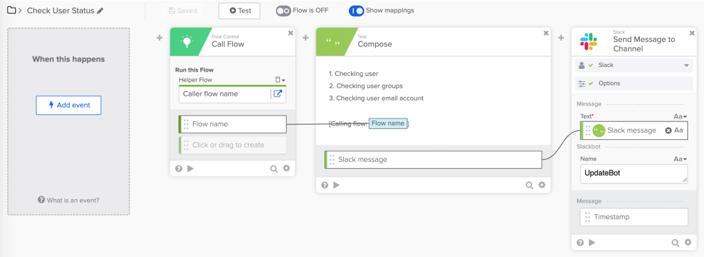 In the main flow below, the Call Flow card calls the helper flow to get the calling flow name. Then the flow name is added to a message in the Compose card and sent to Slack.