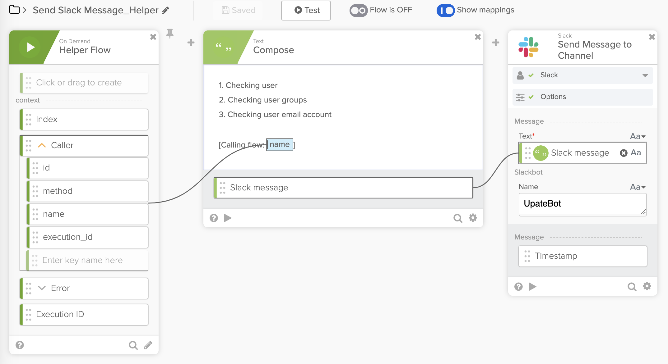 The helper flow below has information about the flow that called it. The object Caller.name is the flow name. The name is added to a message in the Compose card and sent to Slack.