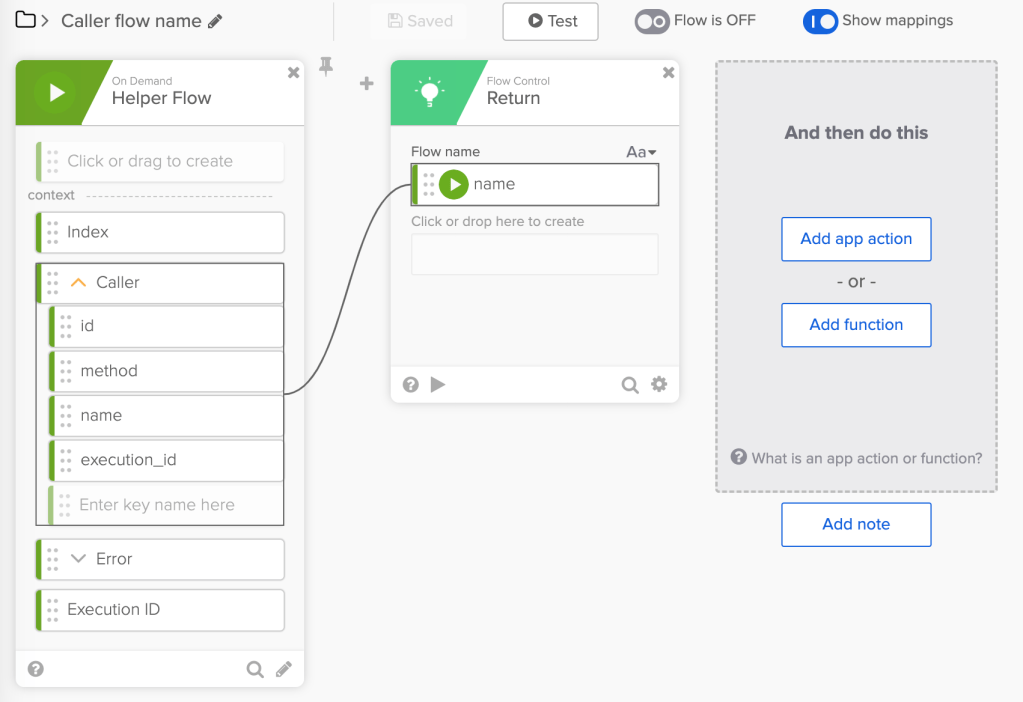 The helper flow below gets the calling flow name (Caller.name) and passes it to the Return card.