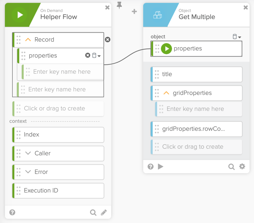 In the screenshot above, the properties key (type Object) is set on the Record field on the Helper Flow card. This allows passing the properties key value to subsequent cards.