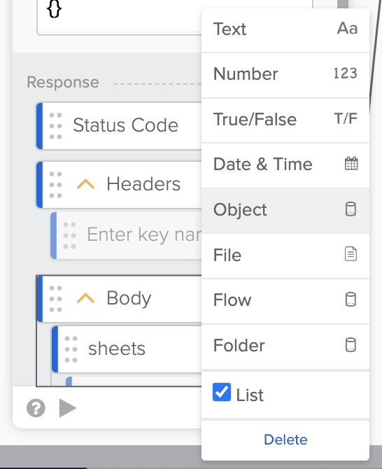 - In the cards Response section, the path sheets is added to the Body field. This allows directly passing the sheets field to the next card
