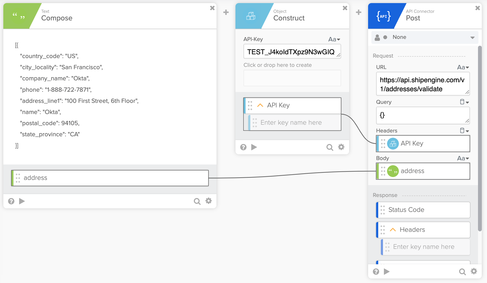 ShipEngine has an API to validate an address. Call this API in Workflows using the API Connector – Post card.