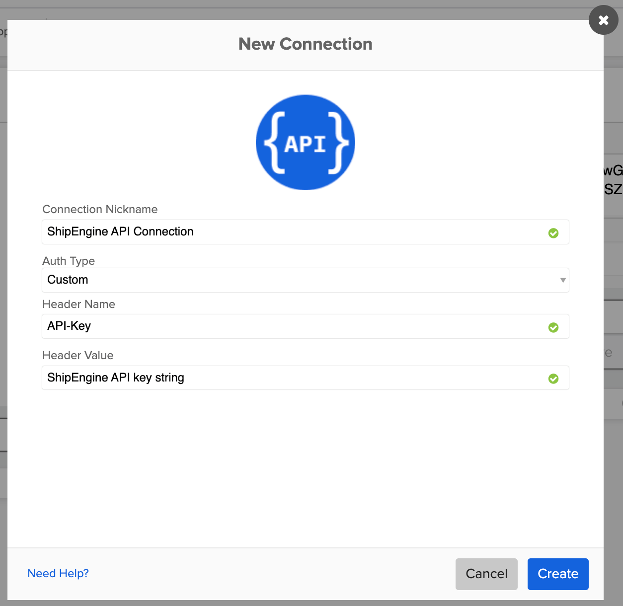 Creating a connection for ShipEngine API looks like this: