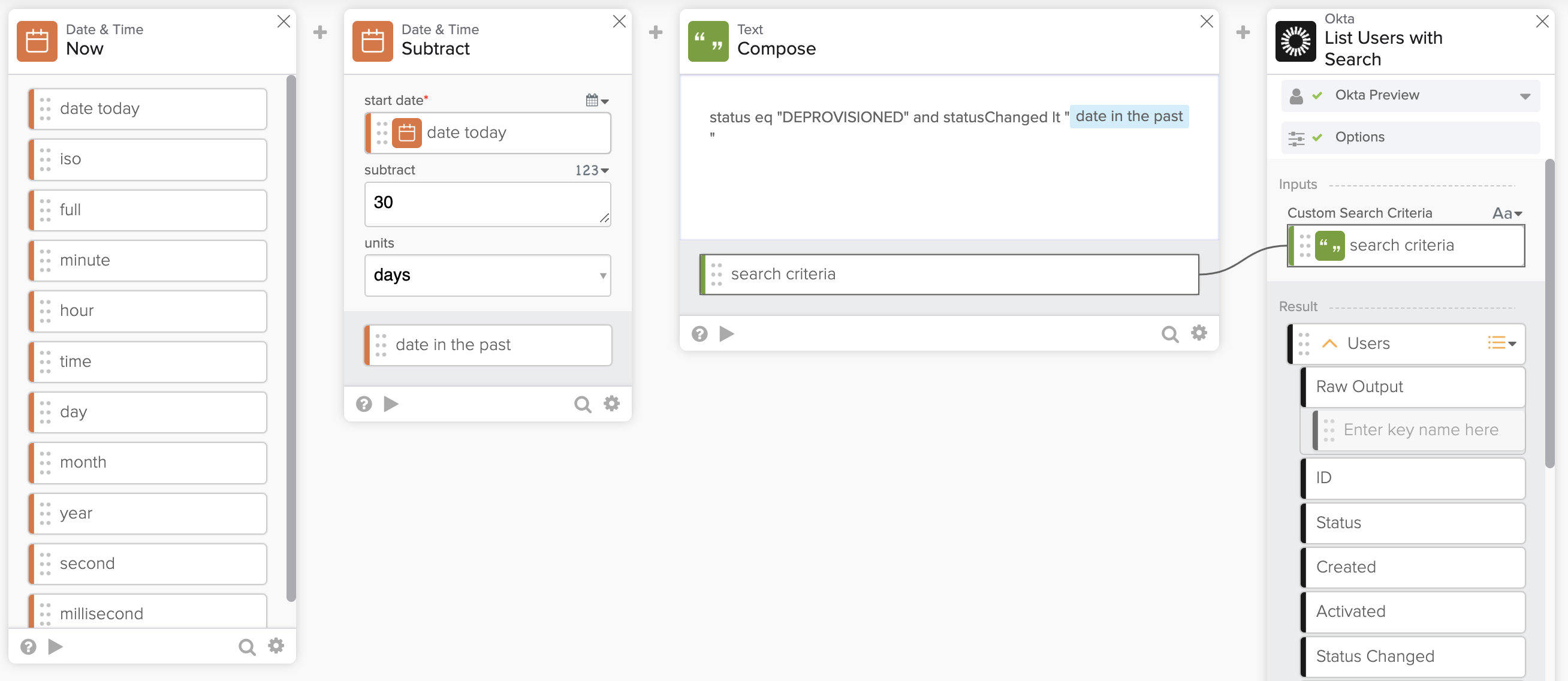 - The Okta – List User with Search card uses the query to find the users who were de-provisioned 30 days ago.