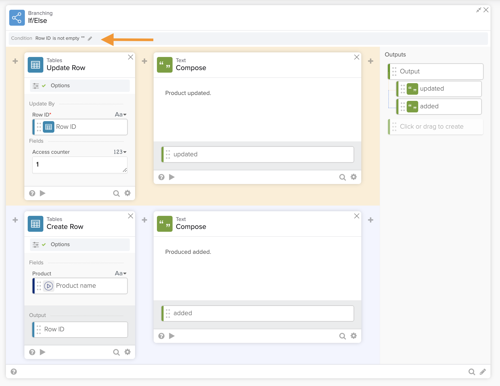 - The Branching – If/Else card determines if the product is in the table or a new product.