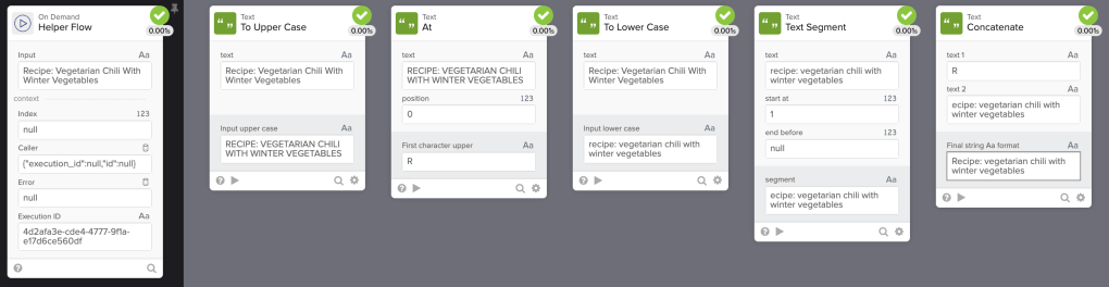 ecipe: vegetarian chili with winter vegetables). - The last card, the Concatenate card, combines the first character in upper case with the segment from step 5 in lower case. The final result is