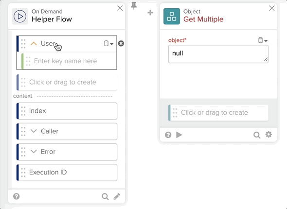 - Click the User object from the Helper Flow card and drag it to the object field in the Get Multiple card.