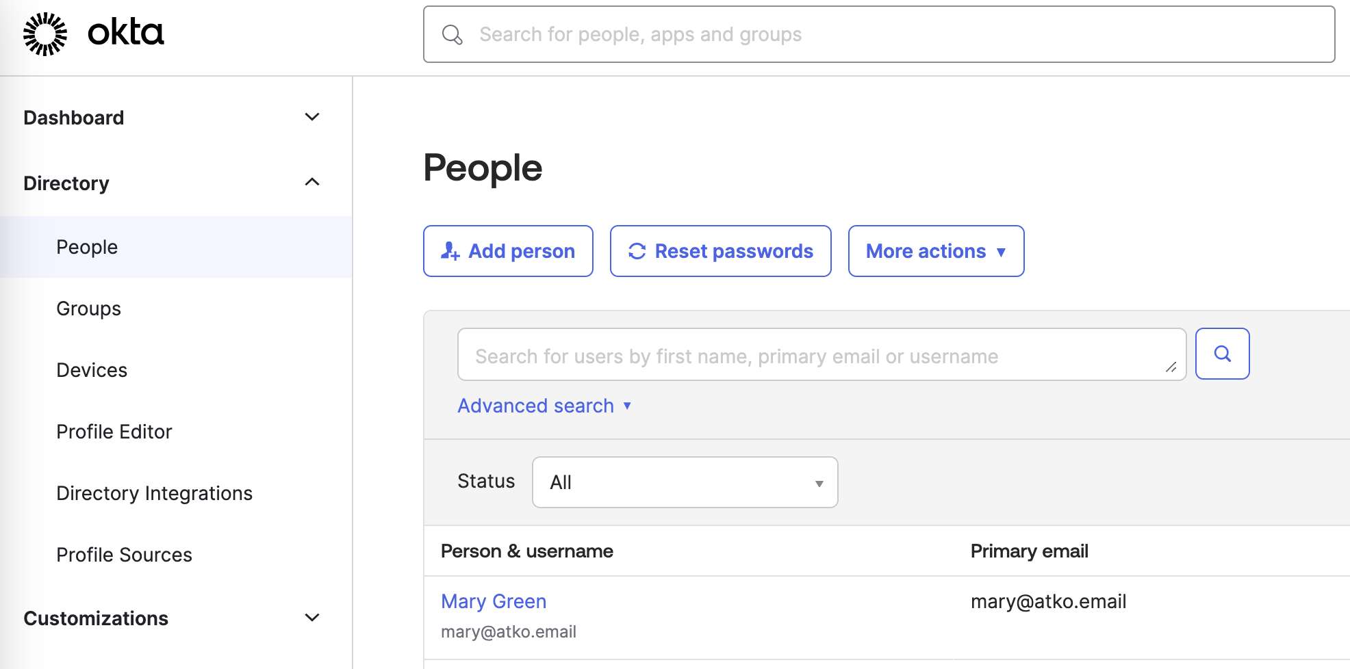- A user is created in Okta. To see the new user, in the admin console, navigate to Directory > People.