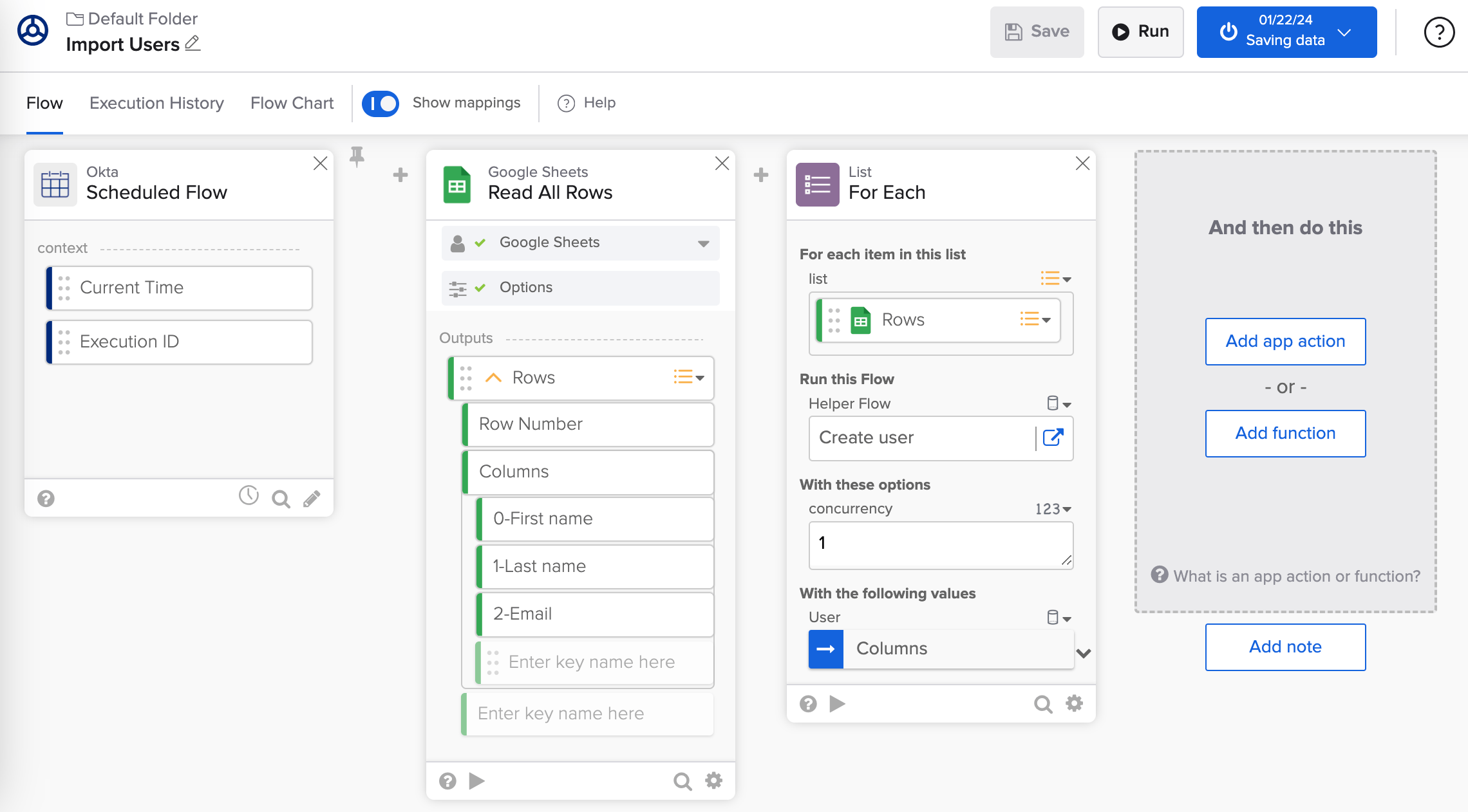 The Import Users flow reads all users from a Google Sheets spreadsheet. The flow then passes every user to a helper flow to create a new person in Okta.