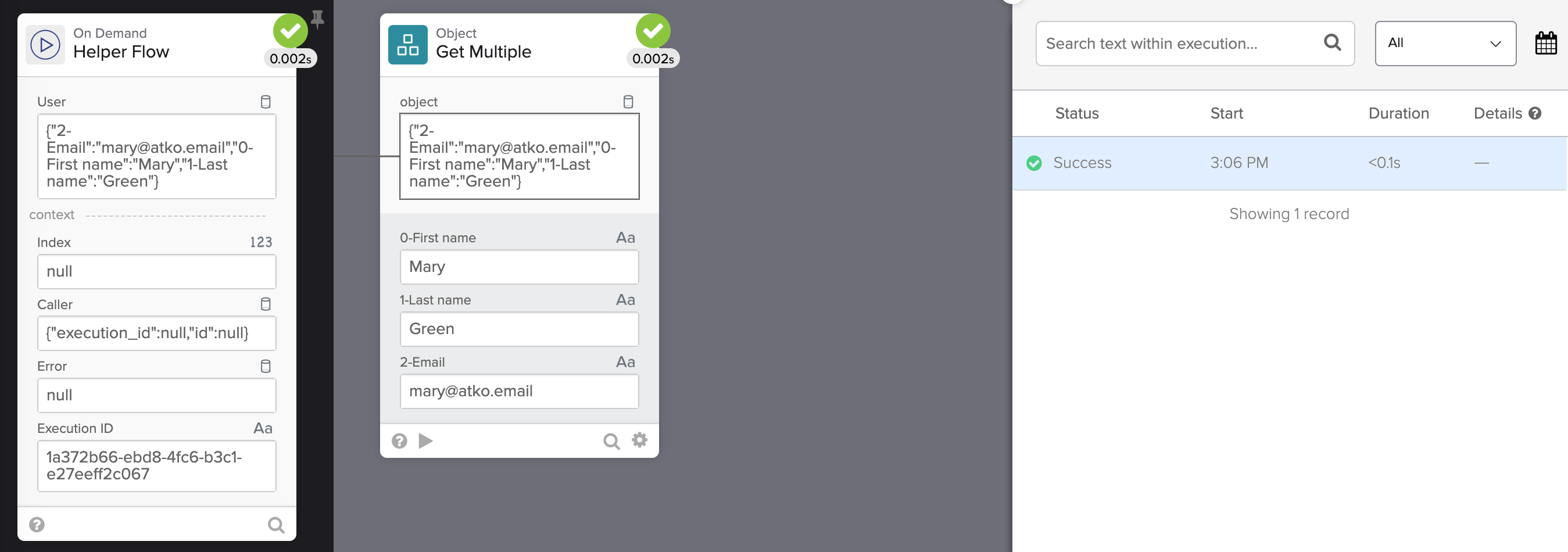 Since you enabled the Save all data that passes through the Flow option, you can select a different flow execution and see the data passed in that flow run.