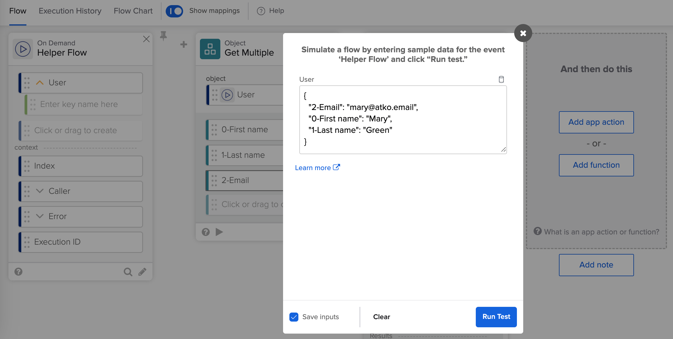You can change data in the JSON object and run the flow again. You can see different flow runs with different data.