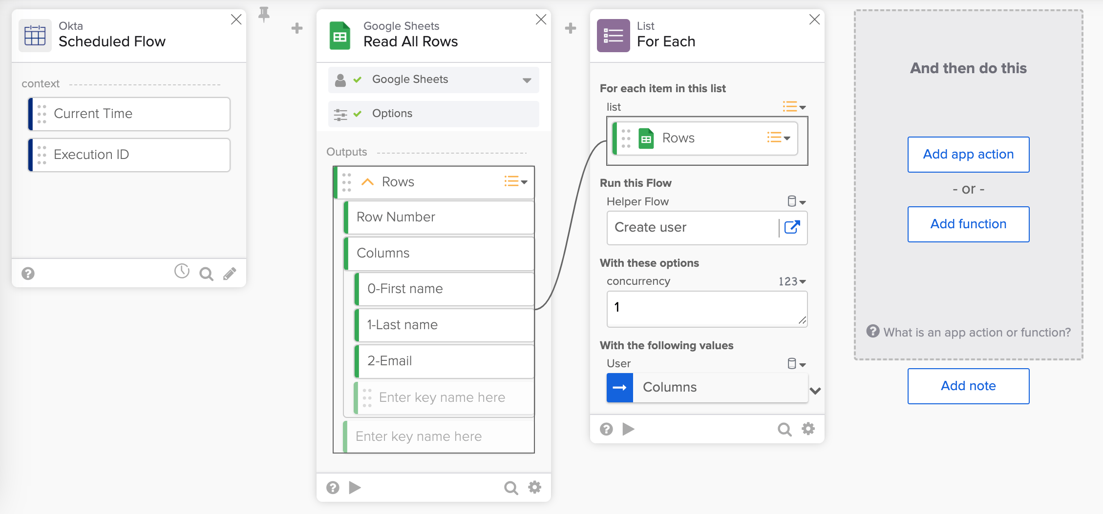 In this step-by-step tutorial, you will build a flow that imports users from Google Sheets spreadsheet and creates new users in Okta.