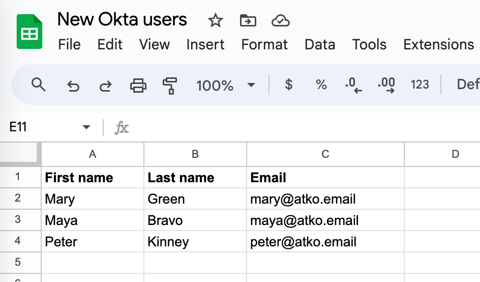 - Create a Google Sheets spreadsheet called New Okta users