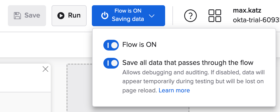 - Also, check “Save all data that passes through the Flow?“ checkbox. You will be using this capability at the end of this tutorial.