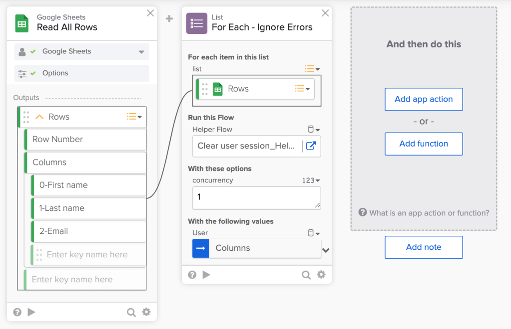 - The Google Sheets – Read All Rows card loads users from a spreadsheet. For these users, we will clear their Okta session.