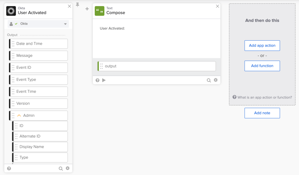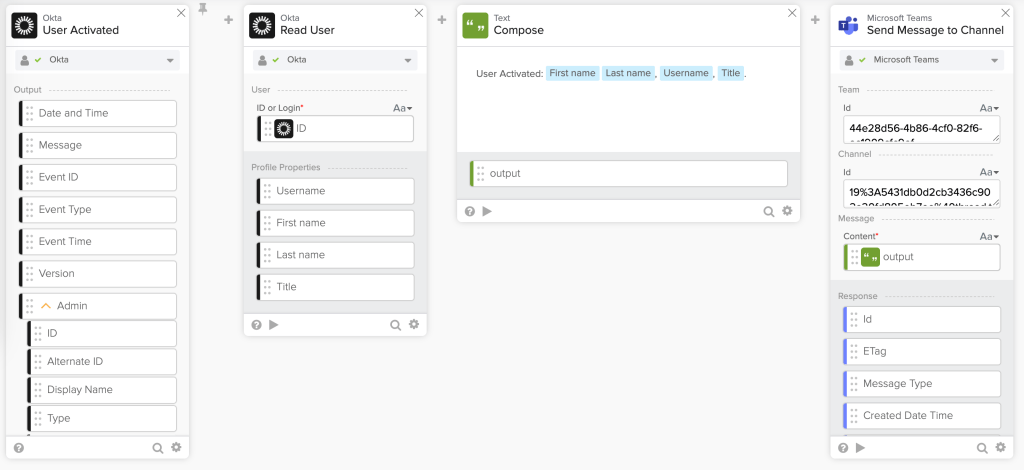 | Send an Email Notification for a New Okta Event Send a Notification to Microsoft Teams for a New Okta Event Send a Rich Message to Microsoft Teams for a New Okta Event Using Microsoft API |